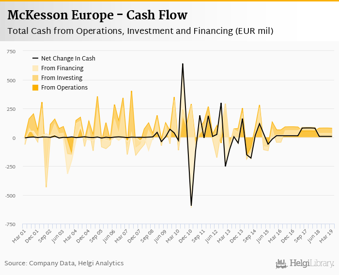 McKesson Europe's operating cash flow stood at EUR 77.4 mil in 1Q2019, up 39.6% when compared to the previous year. Historically, between 1Q2001 - 1Q2019, the firm’s operating cash flow reached a high of EUR 402 mil in 2Q2007 and a low of EUR -266 mil in 2Q2002.
