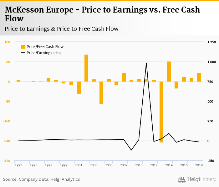 Regarding cash generated defined by the sum of net profit and depreciation, the stock traded at 544x at the end of 2018. When investments are excluded to get free cash flow, McKesson Europe traded at 35.8x.