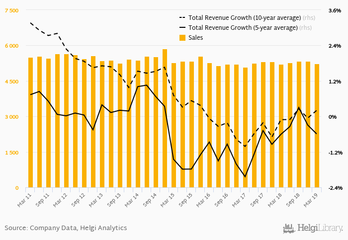 As a longer term comparison, sales have grown by an average of -0.594% a year in the last 5 years and 0.203% in the last 10 years.