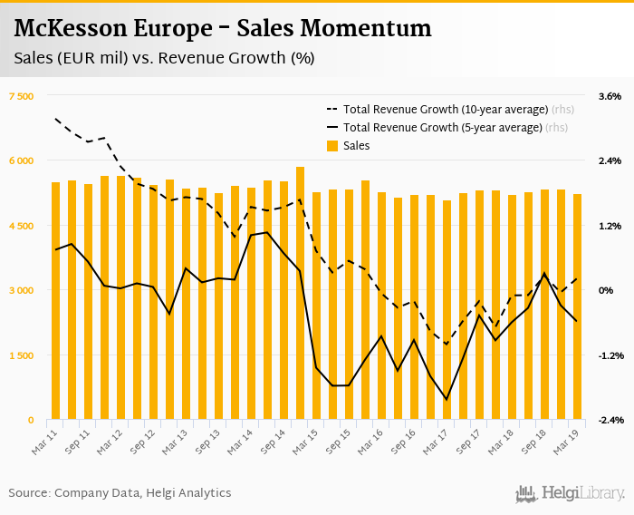 McKesson Europe generated sales of EUR 5,222 mil in 1Q2019, up 0.412% compared to the previous year. Historically, between 1Q2001 and 1Q2019, the company’s sales reached a high of EUR 5,932 mil in 4Q2010 and a low of EUR 4,030 mil in 1Q2001.