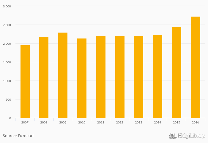 Historically, Mean and median income by household type - Two adults with two dependent children - Mean equivalised net income - Euro in Romania reached an all time high of 2,726 Euro in 2016 and an all time low of 1,951 Euro in 2007.