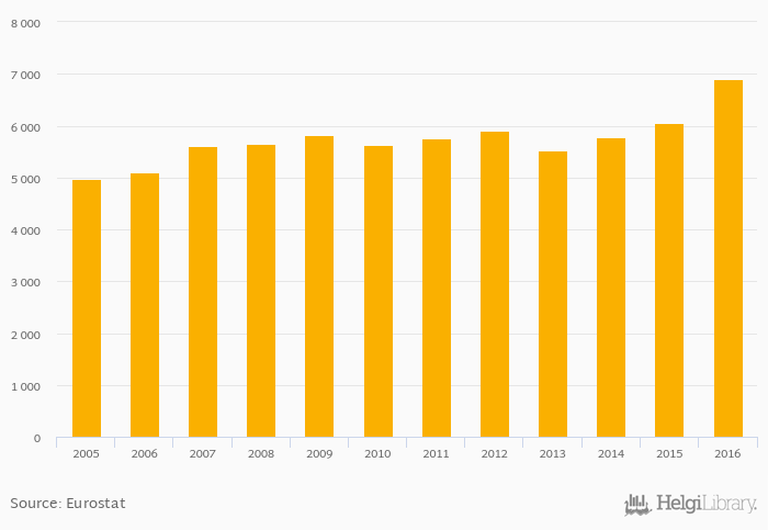 Mean Equivalised Net Income by Educational Attainment Level (From 18 to 64 years) - Less than primary, primary and lower secondary education (levels 0-2) - Total (Purchasing Power Parity) rose 14.0% to EUR 6,900 in Hungary in 2016, according to Eurostat, SILC.