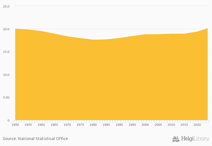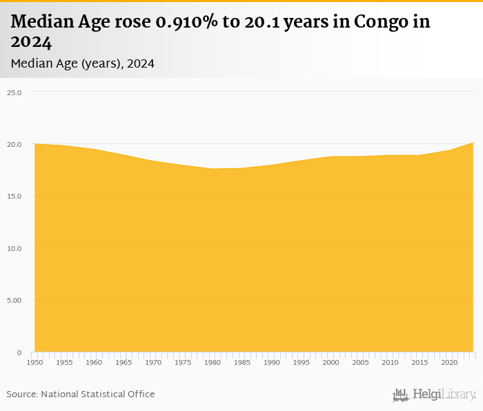 Median age rose 0.910% to 20.1 years in Congo in 2024, according to the National Statistical Office.