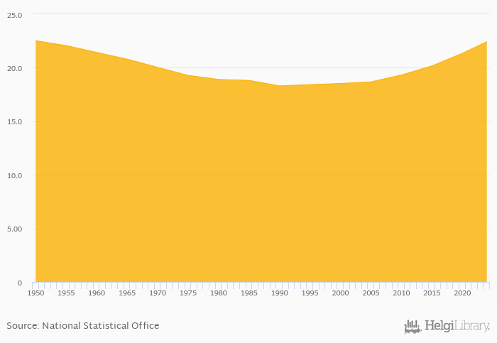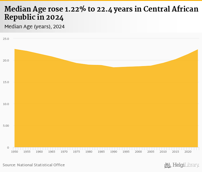 Median age rose 1.22% to 22.4 years in Central African Republic in 2024, according to the National Statistical Office.