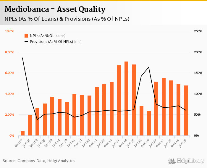 Mediobanca's non-performing loans reached 4.80% of total loans at the end of 2019-06-30, down from 5.31% compared to the previous year. Historically, the NPL ratio hit an all time high of 7.12% in 2014-12-31 and an all time low of 0.432% in 2007-12-31.