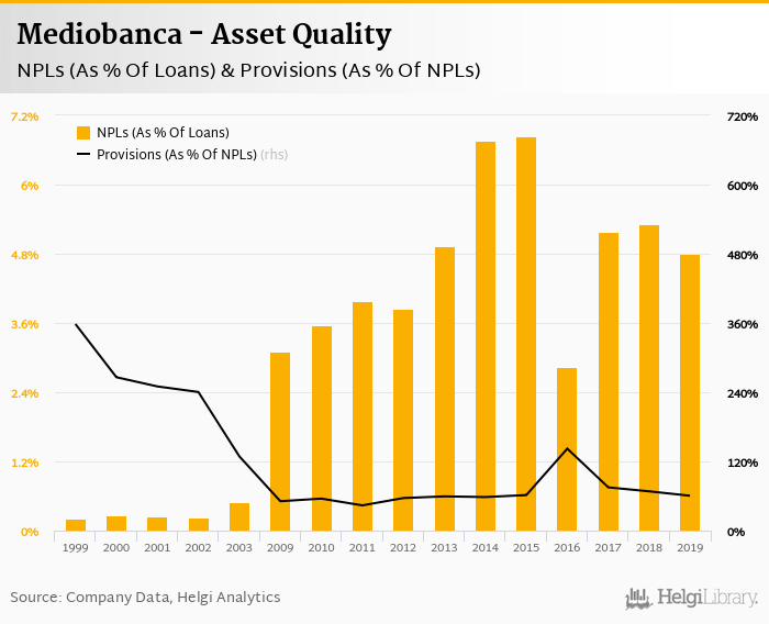 Mediobanca's non-performing loans reached 4.80% of total loans at the end of 2019, down from 5.31% compared to the previous year. Historically, the NPL ratio hit an all time high of 6.83% in 2015 and an all time low of 0.208% in 1999.