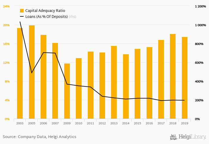 Bank's loan to deposit ratio reached 196% at the end of 2019, down from 198% when compared to the previous year. Some 10 years ago, loan to deposit ratio of the bank amounted to 368%.