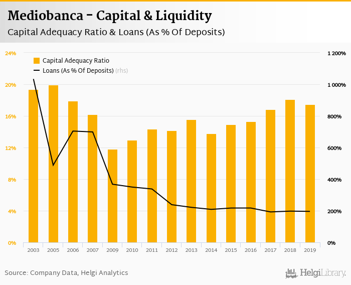 Mediobanca's capital adequacy ratio reached 17.5% at the end of 2019, down from 18.1% compared to the previous year. Historically, the bank’s capital ratio hit an all time high of 19.9% in 2005 and an all time low of 11.8% in 2009.