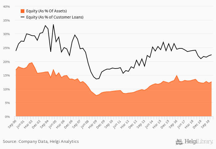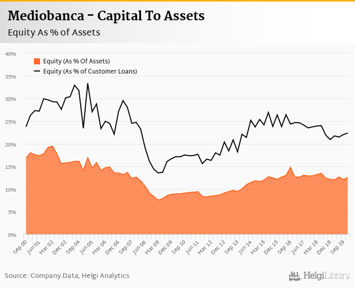 Mediobanca's Equity reached 12.5% of total assets in the 4Q2019, up from 12.1% for the previous year. As a share of net customer loans, the ratio amounted to 22.4% at the end of the fourth quarter of 2019.