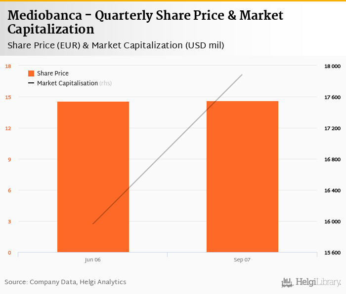 Mediobanca stock traded at EUR 14.6 per share at the end of third quarter of 2007 implying a market capitalization of USD 17,886 mil.