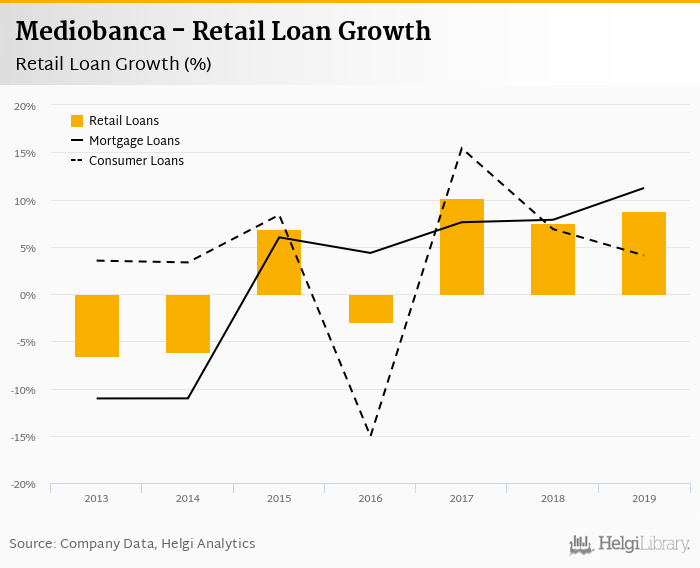 Mediobanca's retail loans reached EUR 35,529 mil at the end of 2019, up 8.76% compared to the previous year. In the last decade, the average annual loan growth amounted to 0%.