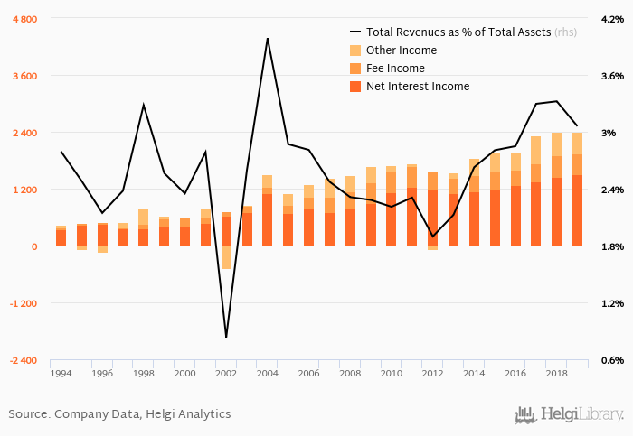 Bank's total revenues accounted for 3.06% total assets in 2019, down from 3.32% a year earlier.