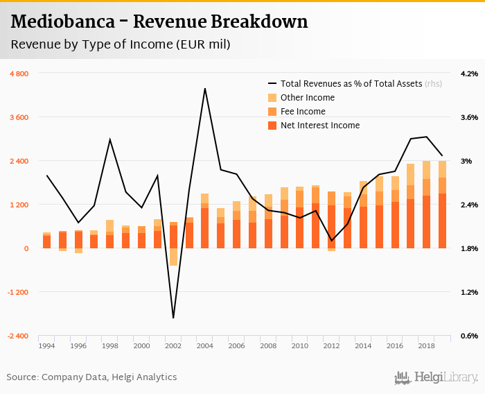Mediobanca generated total banking revenues of EUR 2,393 mil in 2019, down 0.33522391291675% compared to the previous year.