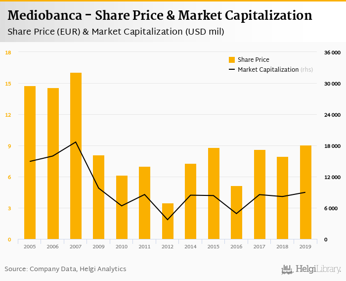 Mediobanca stock traded at EUR 9.07 per share at the end of 2019 implying a market capitalization of USD 8,979 mil.