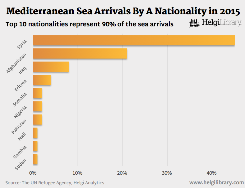 One-in-every-two of those crossing the Mediterranean this year – half a million people – were Syrians escaping the war in their country. Afghans accounted for 20% and Iraqis for seven per cent.