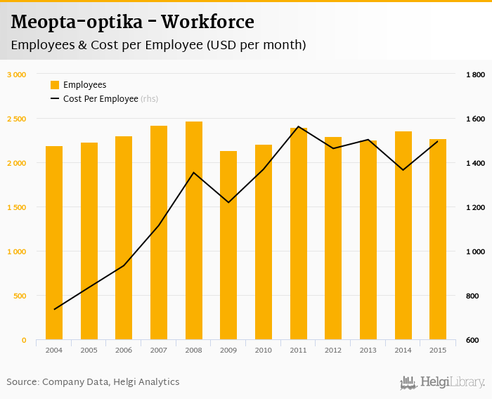 Meopta-optika employed 2,267 employees in 2015, down 3.74% compared to the previous year. Historically, between 2004 and 2015, the firm's workforce hit a high of 2,472 employees in 2008 and a low of 2,134 employees in 2009.