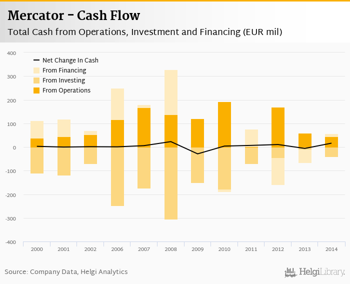 Mercator's operating cash flow stood at EUR 44.3 mil in 2014, down 24.5% when compared to the previous year. Historically, between 2000 - 2014, the firm’s operating cash flow reached a high of EUR 193 mil in 2010 and a low of EUR 1.98 mil in 2011.