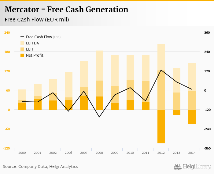 The company generated cash, defined by a sum of net profit and depreciation, of EUR 43.8 mil or 1.65% of sales. When investments are excluded, free cash flow reached EUR 4.42 mil, or 0.167% of sales in 2014.