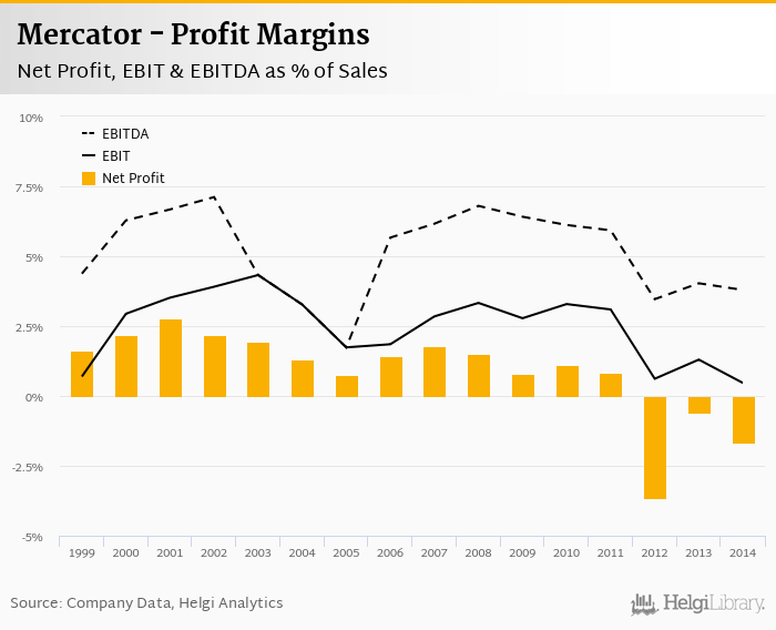 Mercator made a net profit of EUR -44.5 mil with revenues of EUR 2,654 mil in 2014, down by 163% and down by 4.05%, respectively, compared to the previous year.