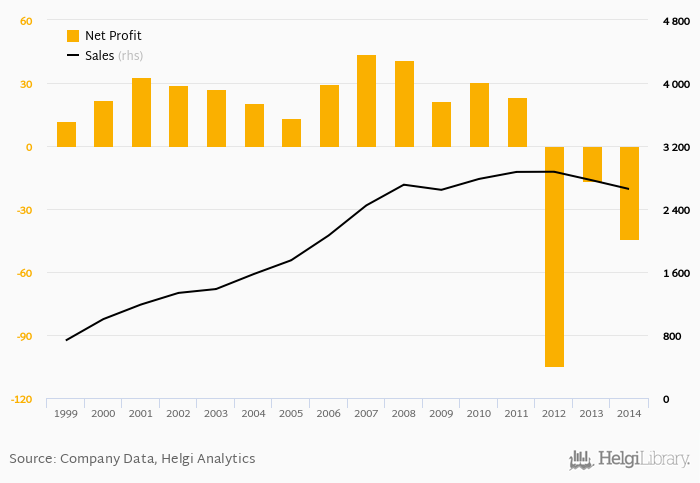 Historically, between 1999 and 2014, the company’s net profit reached a high of EUR 43.8 mil in 2007 and a low of EUR -105 mil in 2012. Over the last decade the firm's net profit increased by an average of 0% a year.