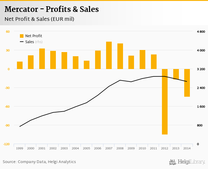 Mercator made a net profit of EUR -44.5 mil in 2014, down 163% compared to the previous year. Total sales reached EUR 2,654 mil, which is down 4.05% when compared to the previous year.