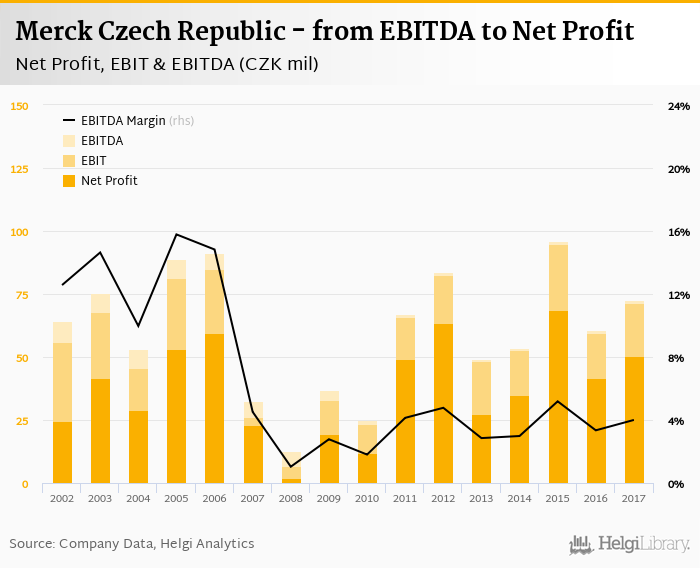 Merck Czech Republic made a net profit of CZK 50.5 mil with revenues of CZK 1,818 mil in 2017, up by 21.7% and down by 0.149%, respectively, compared to the previous year. This translates into a net margin of 2.78%.