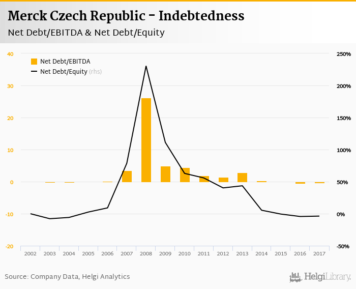 Merck Czech Republic's net debt stood at CZK -25.1 mil and accounted for -3.73% of equity at the end of 2017. The ratio is up 0.620 pp compared to the previous year.