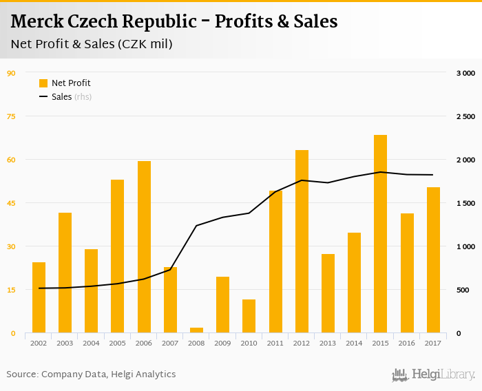 Merck Czech Republic made a net profit of CZK 50.5 mil in 2017, up 21.7% compared to the previous year. Total sales reached CZK 1,818 mil, which is down 0.149% when compared to the previous year.