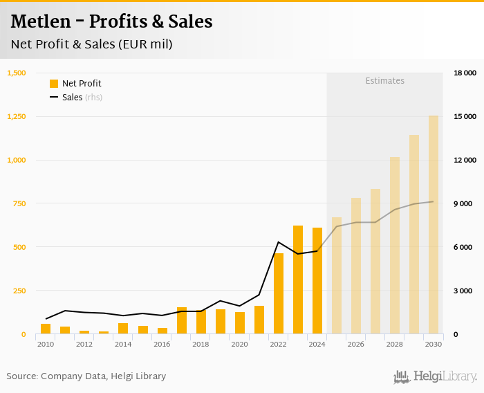 Metlen made a net profit of EUR 615 mil in 2024, down 1.37% compared to the previous year. Total sales reached EUR 5,683 mil, which is up 3.48% when compared to the previous year.