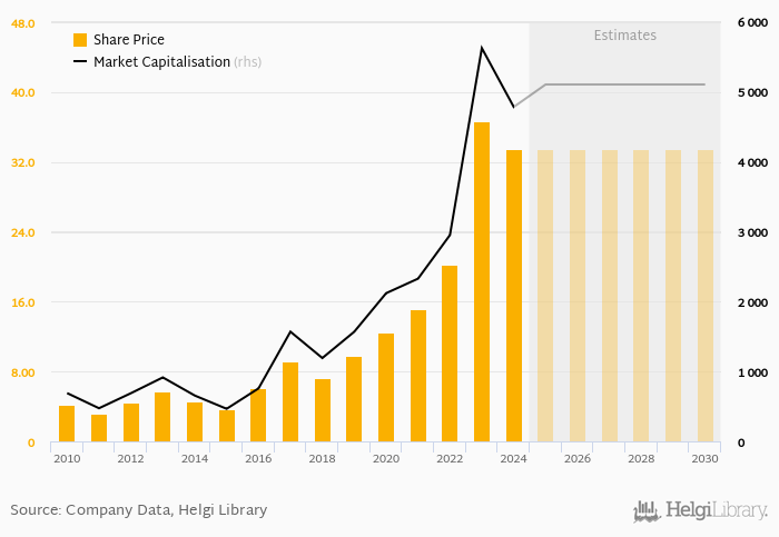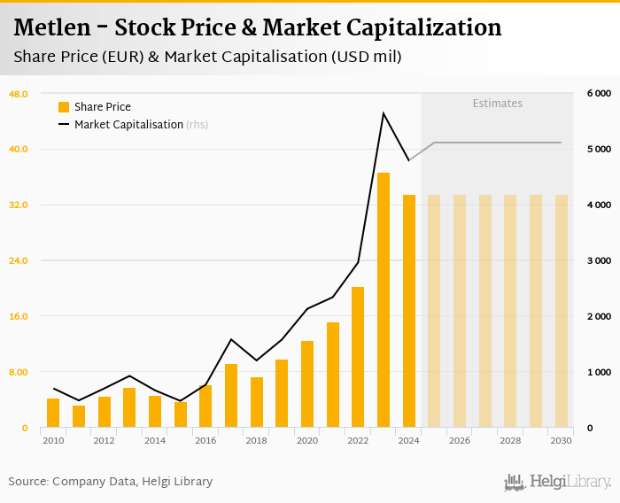 Metlen stock traded at EUR 33.5 per share at the end 2024 implying a market capitalization of USD 4,787 mil.