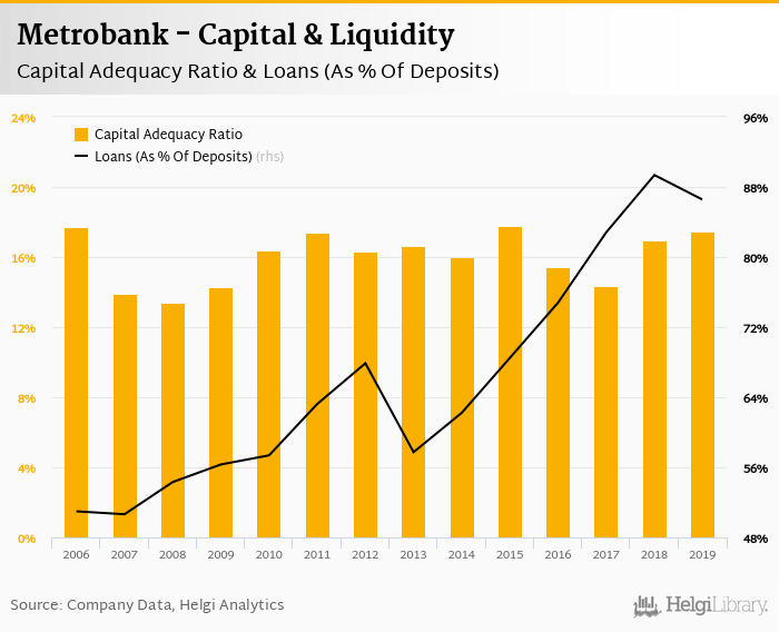 Metrobank's capital adequacy ratio reached 17.5% at the end of 2019, up from 17.0% compared to the previous year. Historically, the bank’s capital ratio hit an all time high of 17.8% in 2015 and an all time low of 13.4% in 2008.