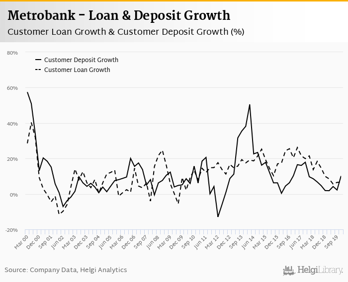 Metrobank's customer loan growth reached 6.65% in 2019-12-31, down from 9.92% compared to the previous year. Historically, the bank’s loans growth reached an all time high of 40.3% in 2000-06-30 and an all time low of -11.6% in 2002-03-31. In the last decade, the average annual loan growth amounted to 15.6%.