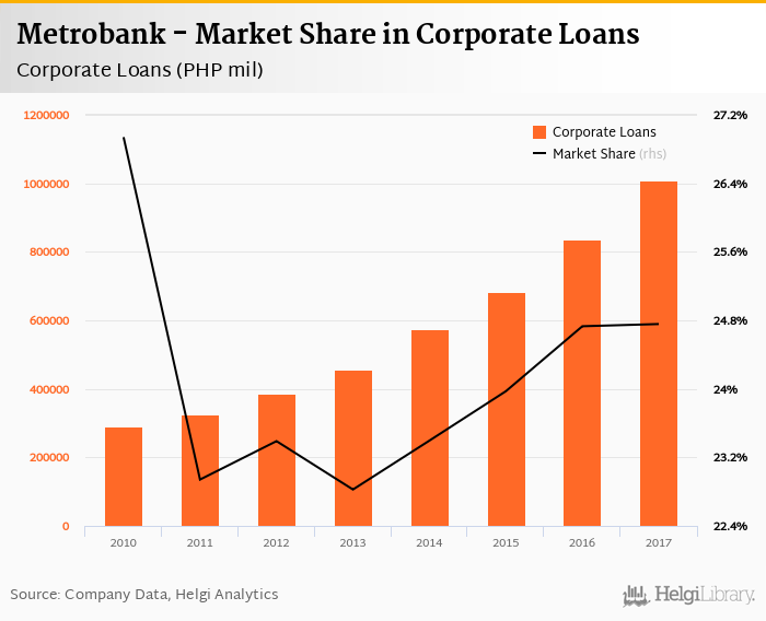 Metrobank accounted for 24.8% of all corporate loans issued in Philippines at the end of 2017. Historically, the bank’s market share in corporate loans reached an all time high of 26.9% in 2010 and an all time low of 22.8% in 2013.