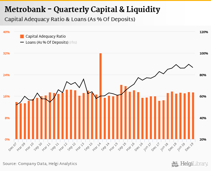 Metrobank's capital adequacy ratio reached 17.5% at the end of fourth quarter of 2019, down from 17.6% when compared to the previous quarter. Historically, the bank’s capital ratio hit an all time high of 32.1% in 1Q2014 and an all time low of 13.4% in 4Q2008.