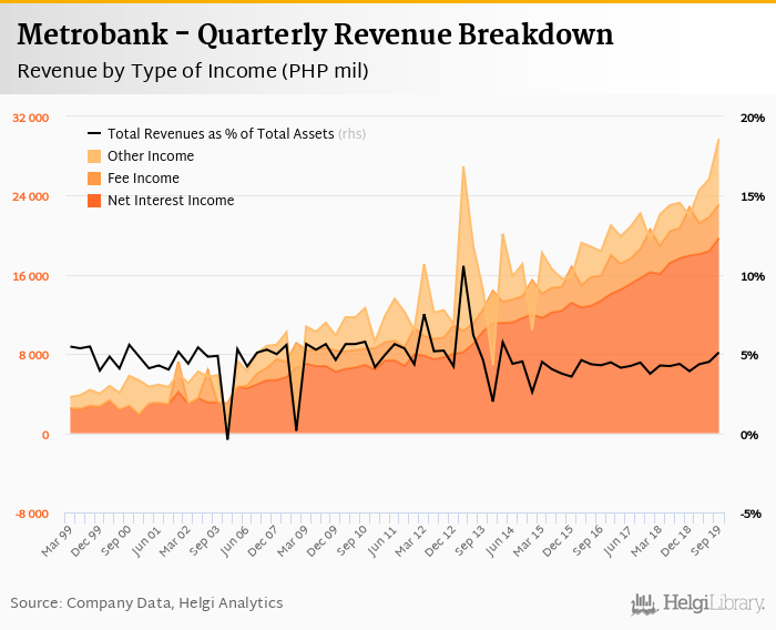 Historically, the bank’s revenues containing of interest, fee and other non-interest income reached an all time high of PHP 29,736 mil in 3Q2019 and an all time low of PHP -501 mil in 4Q2003. The average revenue in the last six quarters amounted to PHP 24,708 mil.
