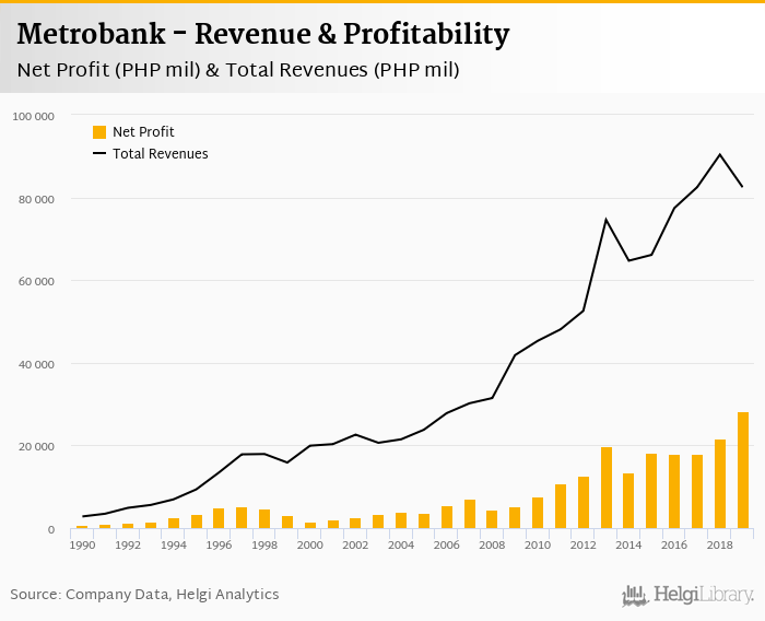 Metrobank made a net profit of PHP 28,278 mil under revenues of PHP 82,469 mil in 2019, up 30.9% and -8.73% respectively compared to the previous year.
