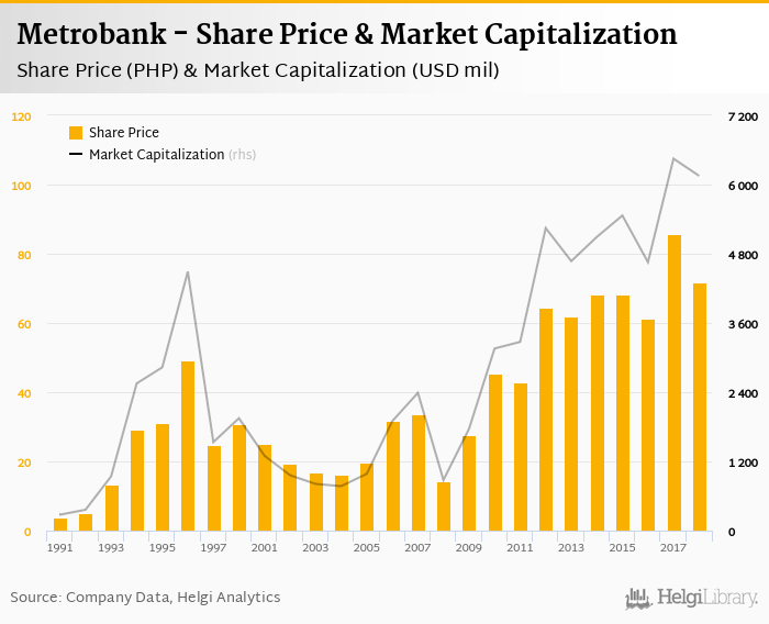 Metrobank stock traded at PHP 71.6 per share at the end of 2018 implying a market capitalization of USD 6,151 mil.
