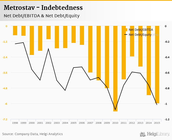 Metrostav's net debt stood at CZK -9,097 mil and accounted for -1.02 of equity at the end of 2015. The ratio is down 0.256 pp compared to the previous year.