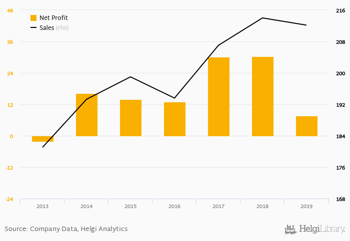 Sales have grown by 1.88% a year on average since 2014. They reached a high of EUR 214 mil in 2018 and a low of EUR 181 mil in 2013.