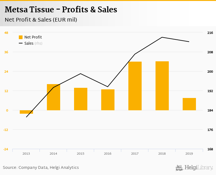Metsa Tissue made a net profit of EUR 7.67 mil in 2019, down 74.6% compared to the previous year. Total sales reached EUR 212 mil, which is down 0.858% when compared to the previous year.