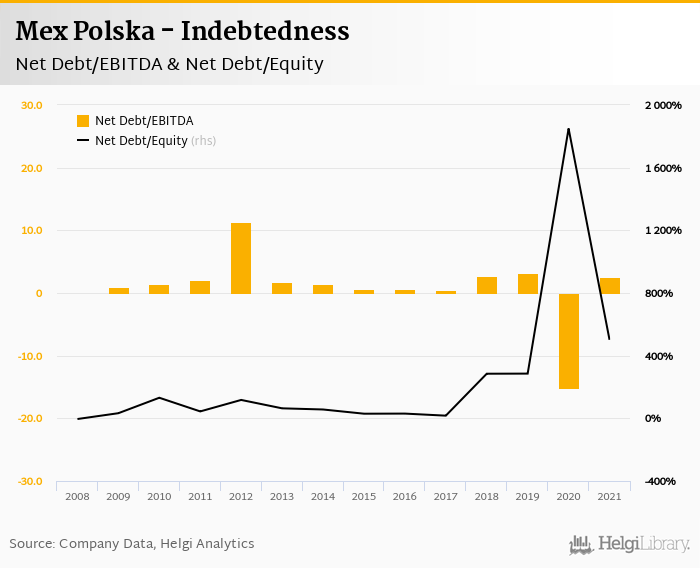Mex Polska's net debt stood at PLN 39.9 mil and accounted for 501% of equity at the end of 2021. The ratio is down 1,349 pp compared to the previous year.