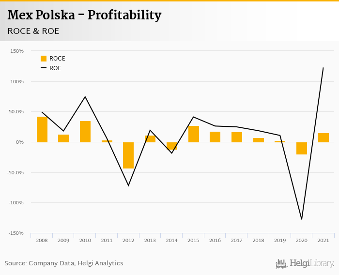 Mex Polska made a net profit of PLN 7.33 mil in 2021, up 171% compared to the previous year. Historically, between 2008 and 2021, the company's net profit reached a high of PLN 7.33 mil in 2021 and a low of PLN -10.3 mil in 2020.