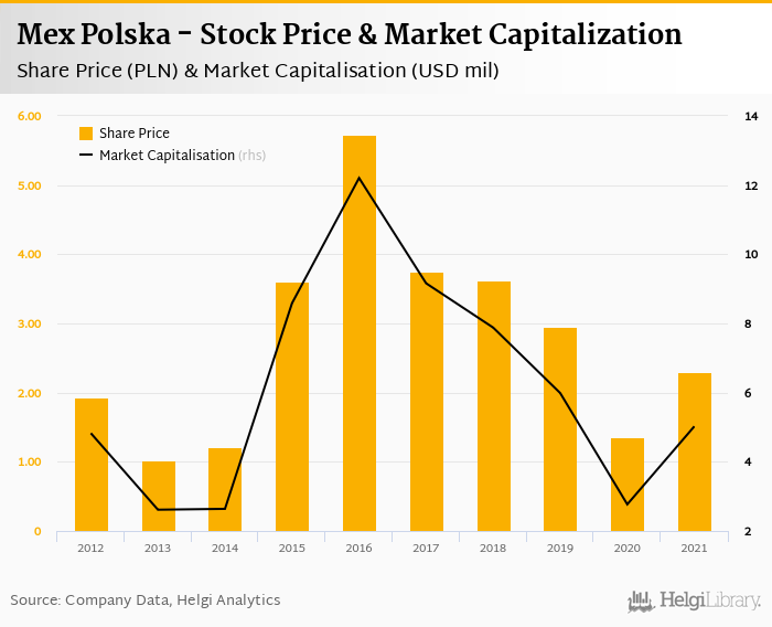 Mex Polska stock traded at PLN 2.30 per share at the end 2021 implying a market capitalization of USD 5.02 mil.