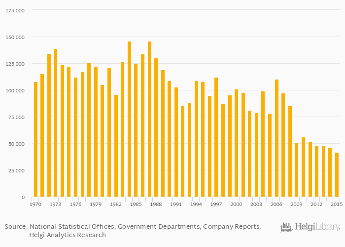 Historically, mica production in the USA reached an all time high of 146,000 tonnes in 1984 and an all time low of 41,500 tonnes in 2015.