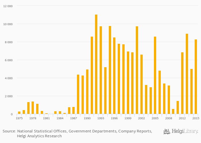 Historically, mica production in Taiwan reached an all time high of 11,038 tonnes in 1992 and an all time low of 44.0 tonnes in 1982.