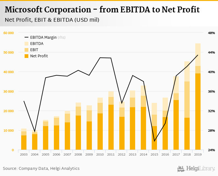 Microsoft Corporation made a net profit of USD 39,240 mil with revenues of USD 125,843 mil in 2019, up by 137% and up by 14%, respectively, compared to the previous year. This translates into a net margin of 31.2%.