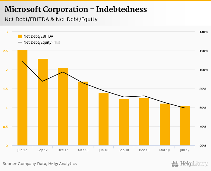 Microsoft Corporation's net debt stood at USD 60,822 mil and accounted for 59.4% of equity at the end of 2Q2019. The ratio is down 18.3 pp compared to the previous year.