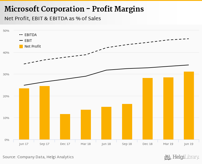 Microsoft Corporation made a net profit of USD 13,187 mil with revenues of USD 33,717 mil in 2Q2019, up by 48.6% and up by 12.1%, respectively, compared to the previous year.