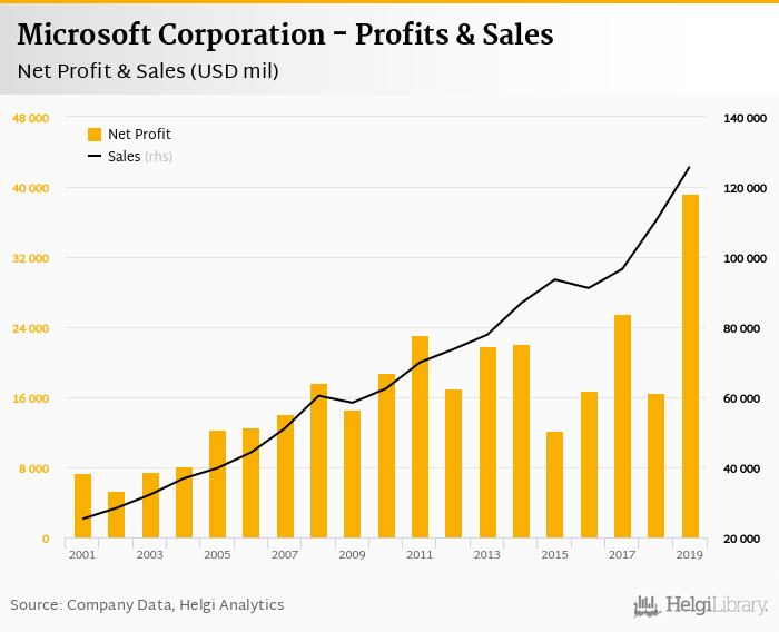 Microsoft Corporation made a net profit of USD 39,240 mil in 2019, up 137% compared to the previous year. Total sales reached USD 125,843 mil, which is up 14% when compared to the previous year.