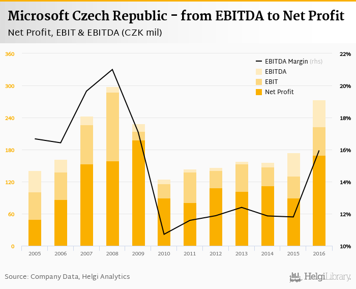 Microsoft Czech Republic made a net profit of CZK 170 mil with revenues of CZK 1,716 mil in 2016, up by 89.6% and up by 16.2%, respectively, compared to the previous year. This translates into a net margin of 9.88%.
